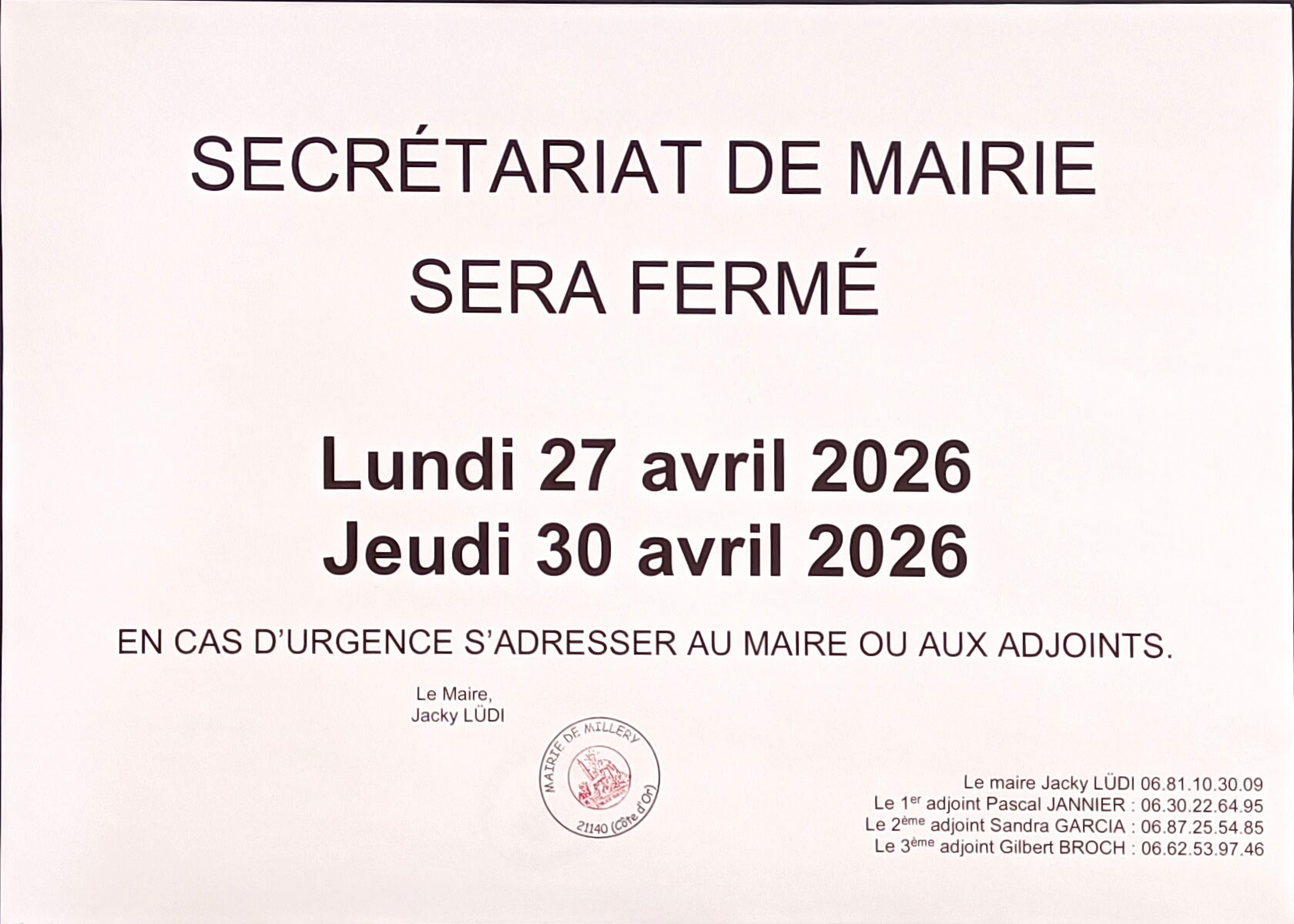 Catégorie : Informations23 avril 2026Navigation articlePrécédent Article précédent :Collecte de don de sang le mercredi 13 mai 2026 à Semur-en-AuxoisArticles similairesCollecte de don de sang le mercredi 13 mai 2026 à Semur-en-Auxois22 avril 2026Arrêté préfectoral portant déclaration d’infection de la faune sauvage par la tuberculose bovine26 mars 2026Enquête publique relative au projet de centrale photovoltaïque – Rapport du commissaire enquêteur17 mars 2026Arrêté municipal relatif à la fin d’occupation d’un terrain communal par une association de moto-cross28 janvier 2026SOS MEDECINS à la MSP de Semur-en-Auxois3 décembre 2025Arrêté préfectoral des ZAER et rapport local de suivi de l’artificialisation des sols19 novembre 2025